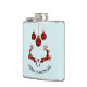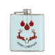 Un matraz festivo que dice "Feliz Navidad" en texto curvo. Diseñado con un ilustracion de 2 ciervos Navidades saltando. Los ciervos están hechos de leñadores rojos y negros, con un poco de corazón entre ellos. Las decoraciones de Navidad rojas y negras se cuelgan desde arriba. Fondo azul claro.