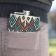 Se trata de una cara decorativa de lobo hecha a mano y estilizada con estampados aztecos en colores negro, rojo, turquesa y beige.