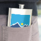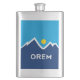 Encaje con un diseño con la bandera de Orem, Utah. Una bandera azul, blanca y amarilla con picos de montaña y el sol en el centro