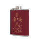 Un matraz con un ilustracion de copos de nieve dorados y elegantes formas cristalinas. La tipografía de moda dice: Bebé, hace frío afuera. Fondo rojo de Borgoña.