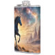 Wild desert black stallion running in a lightning storm, with colorful skies, full of stars and nebulae