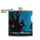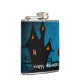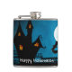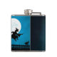 una bruja volando en su escoba pasando la luna llena con una casa oscura en el fondo y un gato en la cerca