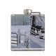 Una tranquila escena de nieve de invierno con un caballo en el pasto, y un brillante cardenal rojo y corona en la puerta.