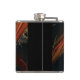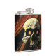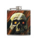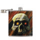 Calavera malvada con zócalos de ojos brillantes y un fondo oscuro salpicado con ramas de naranja, marrón y negro. Feliz Halloween, mortales.
