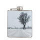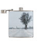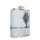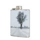 Camino de campo nevado en Suecia en un frío día de invierno. Gran árbol al lado de la carretera y un pueblecito a lo lejos. Fotografía.