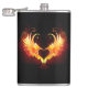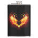 Ángel dispara el corazón con las alas flameantes sobre fondo negro.