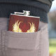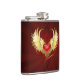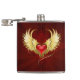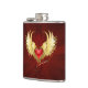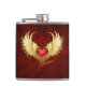 Corazón rojo brillante de un ángel con alas doradas brillando en el fondo rojo oscuro y radiante decorado con un patrón.