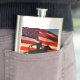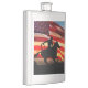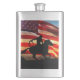 Imagen patriótica de un caballo vaquero y una gran bandera estadounidense. Este es un gran matraz de rodeo de vaqueros occidental.