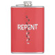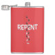 Las huellas caminan hacia abajo y luego hacia arriba hacia una cruz, creada a partir de las huellas y la palabra se arrepiente.