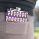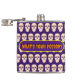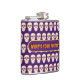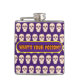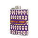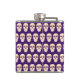 Este matraz tiene un patrón de cráneos en un fondo morado. En la parte delantera hay una pancarta morada con un borde amarillo. El texto que hay dentro dice ¿Cuál es tu veneno?