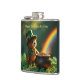 A cute, fuzzy teddy bear wearing a sparkly green leprechaun hat and coat admires a rainbow which is coming from a pot of gold. There are shamrocks on the ground around him.