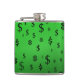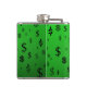 Este matraz presenta un montón de signos de dólar ($) en varios estilos diseminados por un fondo verde.