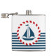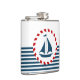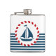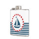 Diseño náutico con decoración de velero en forma redonda sobre fondo de rayas azules y blancas