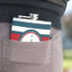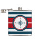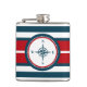 Diseño náutico con decoración de brújula en forma redonda sobre fondo rayado rojo, azul y blanco