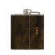 Personalizado de pescadores divertidos tomando un matraz hecho en un marrón antiguo, con gráficos de un pez de boca grande verde saltando para atrapar un insecto naranja. El texto naranja, en la parte delantera, dice: "Reeling in the big boys", un trago a la vez. Personaliza el texto naranja, en la parte posterior, para ti mismo o como una gran idea de regalo para tu angloparo favorito.