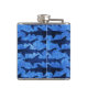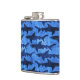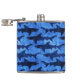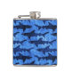 Escuela de grandes tiburones blancos contra un fondo azul profundo.