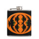 Este fabuloso matraz presenta un oval naranja con seis cuervos. Cada cuervo tiene ojos amarillos con pupilas negras y alas estiradas. Los cuervos están volando unos hacia otros formando una forma oval. El fondo es negro.