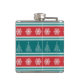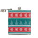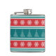Feliz ilustracion navideño con árbol de Navidad y decoración de copos de nieve sobre fondo rayado rojo, blanco, azul y turquesa