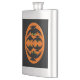 Este fabuloso matraz presenta un oval naranja con seis cuervos. Cada cuervo tiene ojos amarillos con pupilas negras y alas estiradas. Los cuervos están volando unos hacia otros formando una forma oval. El fondo es negro.