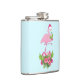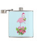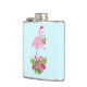 Un matraz con un flamingo de Navidades tropicales con un sombrero de santa rosa. Bajo sus pies, se encuentra un ramo de caña de caramelos con flores tropicales de bonito y bayas rosas. Un brote de holly en el pecho.