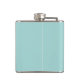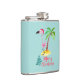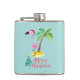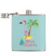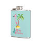 Un matraz con un lindo ilustracion de un flamingo rosado en un sombrero de santa roja. Junto a una palmera verde sobre un montón de arena amarilla. Se coloca un diseño de flamante árbol de navidad junto al texto Feliz Navidad. Escrito en el color rosa en un lujoso tipo de letra manuscrita. Fondo verde pastel.