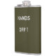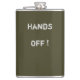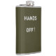 Un frasco de bolsillo elegante en color khaki liso. Texto moderno en blanco crema que dice "No tocar". Un regalo divertido ideal para bodas, cumpleaños y ocasiones especiales.