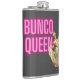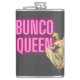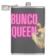 ¡Un diseño muy divertido para las damas que aman Bunco! Mujer bailarina de época en un corte de foto de la corona junto con un texto de neón rosa "Bunco Queen" sobre fondo gris carbón.