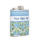 Un matraz de cadera de bonito para personalizar, con un patrón de flores azules de Gloria de la Mañana unidas con un patrón de Check Gingham a juego, todo sobre un fondo blanco. Parte de la colección "Morning Glory" de Posh & Painterly, este patrón se adaptará a todos los frascos.