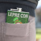 Este gracioso leprechaun del Día de San Patricio pone al "con" en leprechaun en este diseño de juego de palabras. La parte superior dice "Lepre Con" en alambre de púas y la junta directiva que sostiene dice "Departamento de Policía del Paddy Wagon 03-17". Este matraz sería una manera humorística de llevar lo verde para el Día de San Patente.