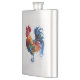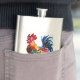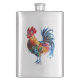 pintura acuarela tradicional de un gran gallo con muchas plumas coloridas sobre sus alas y cola sobre un matraz.