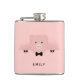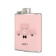 Un matraz personalizado con un dibujo de la cara de un lindo cerdo rosado. Llevando una corbata negra. Levantado por sus pezuñas negras y mirando hacia usted. Dibujo tierno y caprichoso. Envuelto en un fondo rosado con algunos corazones desvanecidos aquí y allá.