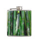 Un frasco de temática asiática. Fotografía de una hilera de tallos verdes y amarillentos de bambú verde.