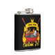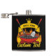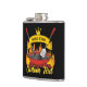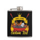 Parrilla barbacoa sobre carbón vegetal en llamas, banner de desplazamiento con texto personalizado sobre el tenedor y la espátula. Color de fondo personalizado. Texto inferior personalizado.
