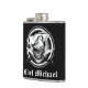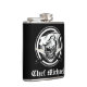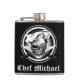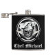 Un cráneo de guiño fresco y divertido del cocinero con los cuchillos cruzados del cocinero, contra un fondo negro. Añada su nombre, para un tacto personalizado.