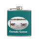 En un día de primavera gris en Alaska, dos ocas canadienses, a menudo llamados "honkers", nadan en una masa de agua parcialmente asfixiada con hielo. También aparece el texto "Canada Goose". La ganso canadiense, Branta canadensis, tiene la cabeza y el cuello negros, parches blancos en la cara y un cuerpo gris pardo. La cabeza negra y el cuello con "chinstrap" blanco distinguen a la ganso de Canadá de todas las demás especies ganaderas, con la excepción de la ganso de Barnacle, pero esta última tiene una pechuga negra, y también un plumaje corporal gris, en lugar de marrón. El ganso de Canadá tiene entre 30 y 43 pulgadas de longitud y tiene una envergadura de 50 a 73 pulgadas. Los hombres suelen pesar entre 7,1 y 14 libras y pueden ser muy agresivos en la defensa del territorio. La hembra se ve prácticamente idéntica, pero es ligeramente más liviana de entre 5,5 y 12 libras, y tiene una honda diferente. La duración de la vida en el medio silvestre de los gansos que sobreviven hasta la edad adulta oscila entre los 10 y los 24 años de los gansos de Canadá son nativos de América del Norte. Se reproducen en Canadá y el norte de Estados Unidos en una variedad de hábitats. Los nidos suelen estar situados en una zona elevada cerca del agua, como arroyos, lagos, estanques y a veces en un pabellón de castores. Los huevos se depositan en una depresión poco profunda, bordeada de material vegetal y se caen. En los últimos años, las poblaciones de ganso de Canadá en algunas áreas han crecido sustancialmente, tanto que muchos las consideran pestes por sus excrementos, bacterias en sus excrementos, ruido y comportamiento confrontacional. Este problema se debe en parte a la remoción de depredadores naturales y a la abundancia de cuerpos de agua seguros y hechos por el hombre, como los que se encuentran en campos de golf, en parques públicos y playas, y en comunidades planificadas. Debido en parte a la interconexión de varias subespecies migratorias con las subespecies gigantes no migratorias introducidas, los ganeses de Canadá son a menudo una característica de este tipo de ambientes urbanos durante todo el año. Los alemanes del Canadá han llegado naturalmente a la Europa septentrional, como se ha demostrado con las recuperaciones resonantes. Las aves son al menos de la subespecie parvipes, y posiblemente de otras. Los geneses de Canadá también se encuentran naturalmente en la península de Kamchatka en Siberia Oriental, China Oriental y en todo Japón. Como la mayoría de los gansos, la ganso canadiense es migratoria, siendo el invierno la mayor parte de los Estados Unidos. El señuelo de los grandes grupos de gesos canadienses que vuelan en formación en forma de V indica las transiciones hacia la primavera y el otoño. En algunas zonas, las rutas migratorias han cambiado debido a los cambios en el hábitat y las fuentes de alimentos. En climas templados desde California hasta los Grandes Lagos, parte de la población se ha convertido en no migratoria debido a un adecuado suministro de alimentos en invierno y a la falta de ex depredadores. Los gansos del Canadá son principalmente herbívoros, aunque a veces comen pequeños insectos y peces. Su dieta incluye vegetación verde y granos. La ganso canadiense come una variedad de hierbas cuando está en tierra. Se alimenta agarrando una hoja de pasto con el billete, después se lo rasga con un imbécil de la cabeza. La ganso canadiense también come granos como trigo, frijol, arroz y maíz cuando están disponibles. En el agua, se alimenta de seda en el fondo del cuerpo del agua. También se alimenta de plantas acuáticas, como algas marinas. En las ciudades urbanas, también se sabe que recogen comida de los basureros. A los gansos adultos se les ve a menudo llevando sus chismes en una línea, por lo general con un padre al frente, y el otro al fondo. Mientras protegen sus chismes, los padres a menudo persiguen violentamente a criaturas cercanas, desde pequeños negros hasta seres humanos solitarios que se acercan, después de advertirles dando un silbido y luego atacarán con picaduras y bofetadas de las alas si la amenaza no se retira o se ha apoderado de un chisme. La mayoría de las especies que se aprovechan de los huevos también tendrán un chisme. Aunque los padres son hostiles a los gansos desconocidos, pueden formar grupos de varios chismes y algunos adultos, llamados guarderías.