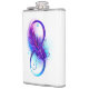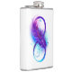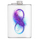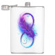 Símbolo infinito con una hermosa pluma pintada de color violeta y azul brillante sobre fondo blanco.