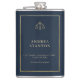 Celebrate and gift your law school grad - or yourself - with this elegant, classic law school graduation, lawyer or law office personalized flask with a navy and gold theme. Replace the scales of justice with the logo of your school or leave it as is. The contemporary typography design is elevated by the gold hues and the minimalist layout. A brushed faux gold frame decorates the typography area. Customize every line of text. Navy and faux gold.