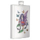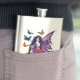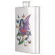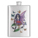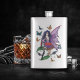 Hadas de pelo negro y cortado, todo de color morado y rojo, sentado en un hongo sobre un fondo morado