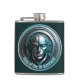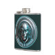 Un gran diseño de matraz de bolsillo de ciencia ficción con una máscara de robot azul escalofriante con efecto metálico. El texto dice "Auge del AIN", pero puedes cambiarlo si quieres. Es un guiño en la dirección de cómo la inteligencia artificial podría conducir a un futuro terrible donde las máquinas tienen dominio sobre los humanos.