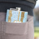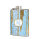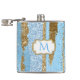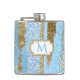 Glitzy matamoscas de bebida, con gráficos de diseño de rayas verticales hechos en oro y azul, pintura y aspecto purpurina. Los gráficos de una placa de borde purpurinoso de oro, en la parte delantera del matraz, tienen un monograma azul de una sola letra listo para personalizar.