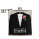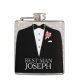 Mejor hombre vestido con inteligencia en esmoquin y lazo negro boda gráfico frente al matraz de cadera. Lee al mejor hombre Joseph. Personaliza con tu propio nombre y título. Una gran idea de regalo personalizada para la unión masculina en noches de pavos / noches de ropa, ensayos de bodas o como un favor de boda.