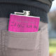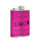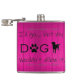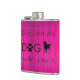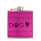 Un matraz perfecto para los que prefieren la compañía de perros y las comodidades de casa. Este diseño del matraz incluye un texto que dice "Yo iría...pero mi perro no lo permitiría", con una huella de pata y adornos de silueta de perro contra un fondo de madera magenta. También hay artículos de regalo adicionales disponibles con este diseño.