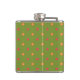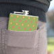 Un matraz de cadera de moda, con puntos de Polka en tonos rosados, Naranja en un fondo verde. Los colores se coordinan con la colección "Campos de adormidera" de Judy Adamson.