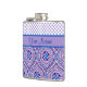 Un matraz de cadera de moda para personalizar, con un patrón de mezcla de formas ogro tradicionales en berenjena, azul y blanco, unido con puntos de polka pale mauve coincidentes en un fondo blanco. Parte de la colección "Purple Pop" de Posh & Painterly.