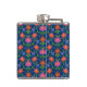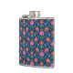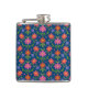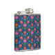 Un matraz de cadera envuelto en vinilo de moda, con un colorido patrón de flores Naranjas y rosas y puntos de polka en un fondo azul profundo que se puede cambiar si se desea. (Negro, Blanco, Amarillo Dorado y Turquesa son grandes alternativas!) Parte de la colección "Rangoli" de Posh & Painterly, este patrón de baldosas de bonito se puede ajustar para que se ajuste a cualquiera de las matraces de cadera.