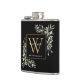 Elegantes hojas de vegetación en acuarela con monograma de nombre en frasco destacando una inicial de monograma dorado sobre un fondo negro chic. Diseñado por Thisisnotme©