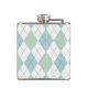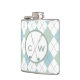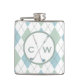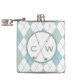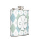 Matraz de bebida con temática de golf realizado en un estilo de argyle azul pálido, verde y blanco. En la parte delantera, un círculo está decorado con dos clubs de golf cruzados. Las iniciales primera y segunda del monograma están listas para personalizar.