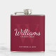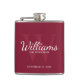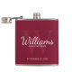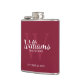 Añada un toque personal a su boda con un matraz de groomsmen personalizado. Este matraz presenta el nombre de groomsman personalizado en estilo de letra de escritura clásico blanco con detalles bodas en estilo de letra serif clásico blanco y monograma en estilo de fuente serif rojo burdeos claro estilo de fuente serif clásico como fondo, sobre fondo rojo burdeos. También perfecto para el mejor hombre, padre de la novia y más.