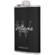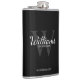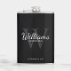 Añada un toque personal a su boda con un matraz de groomsmen personalizado. Este matraz presenta el nombre de groomsman personalizado en estilo de letra de escritura clásico blanco con detalles bodas en estilo de fuente serif clásico blanco y monograma en estilo de fuente serif gris claro clásico como fondo, sobre fondo negro. También perfecto para el mejor hombre, padre de la novia y más.