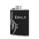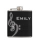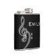 Un elegante matraz de licor con temática de música en blanco y negro - trébol blanco y arcos de bajo contra un fondo negro texturado. Música, vino, vino y música. Combinación perfecta. ¡personalizar con tu nombre!